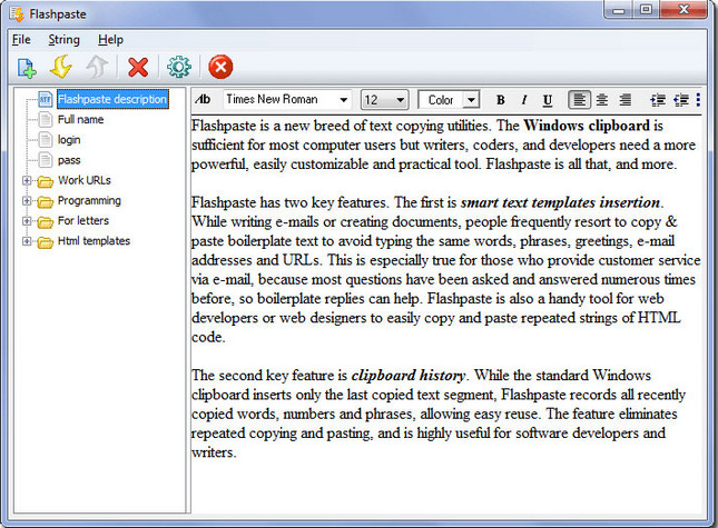 Flashpaste offre una soluzione potente ed altamente efficiente per risparmiare tempo con la digitazione. Puoi utilizzare il programma per digitare e utilizzare modelli di testo, in un modo che estende notevolmente la funzione appunti standard non fornita in Windows. Non avrai più bisogno di tagliare e incollare costantemente testi diversi da diverse fonti. Non solo questa soluzione ti permette di risparmiare tempo in ogni caso; aiuta anche ad evitare errori di stampa inevitabili quando si digita tutto ogni volta in maniera manuale. Per gli utenti casuali, la funzione appunti potrebbe essere sufficiente, ma in molti casi, semplicemente non possiede le caratteristiche richieste per risparmiare tempo e per ottenere un lavoro fatto in maniera affidabile e in maniera rapida.