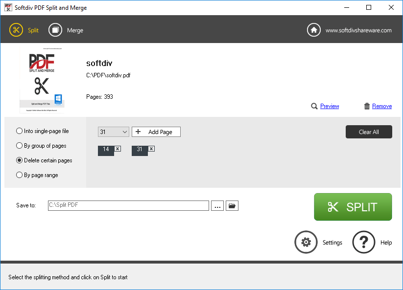 Si può specificare se combinare tutte le pagine oppure solo una serie di pagine. Softdiv PDF Split and Merge ti permette anche di dividere un grande file PDF in parti più piccole. Supporta diversi tipi di metodi di divisione (Dividi in un file PDF con pagina singola, Cancella le pagine indesiderate, Cancella serie di pagine indesiderate e Dividi per gruppo di pagine) per eseguire diversi obiettivi di divisione.