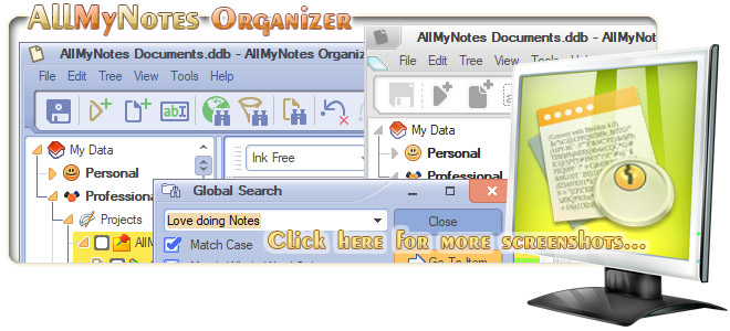 AllMyNotes Organizer è un programma di gestione dati molto semplice tradotto in 30 lingue, che fornisce una serie di strumenti molto semplici da utilizzare per organizzare i vostri dati. Il programma permette di pianificare informazioni testuali e grafiche (struttura ad albero), editor di testo che supporta: tabelle (compresa la selezione), sveglie, allegati (con anteprime per le immagini), chiamate tramite doppio click (con Skype o qualsiasi altra app VoIP).
