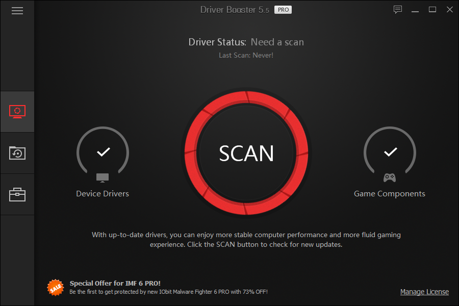 Driver Booster è un programma per l'aggiornamento dei driver, creato con la tecnologia di aggiornamento driver di IObit più efficace. Il programma scansiona e identifica i driver obsoleti automaticamente, scarica e installa gli aggiornamenti appropriate per te con UN solo click. Recupera il sistema ed effettua il backup con il suo Rescue center. Offre anche maggiori prestazioni di gioco e protegge il tuo computer dagli errori hardware, i crash e conflitti di sistema. Risparmia il tuo tempo con Driver Booster Pro.