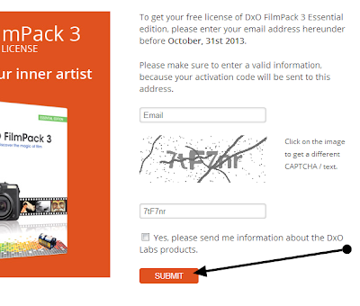 Per ottenere una licenza gratuita di DxO FilmPack 3 Essential edition, andare in questa pagina, inserisci il tuo indirizzo e-mail qui prima del 31 Ottobre 2013. Controlla la tua cartella spam per il codice di attivazione.