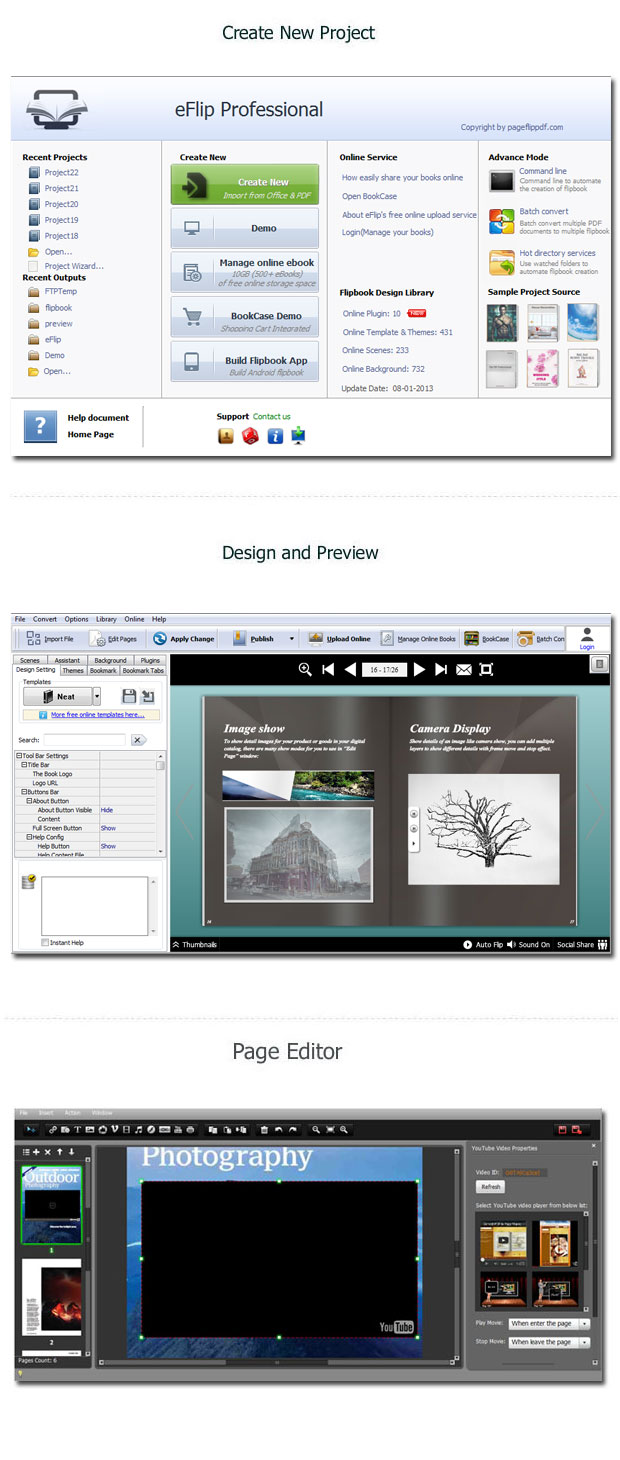 Se volete creare splendide Brochure, Flipbook sfogliabili o riviste partendo da documenti e immagini sono disponibili molti programmi in giro per il Web. Il più famoso è sicuramente Scribus che è il migliore nel suo campo, poi ce ne sono molti altri tra cui eFlip che permette di creare fantastici libri sfogliabili in pochi e semplici passi tramite una serie Wizard e procedure guidate in modo da facilitare il tutto.
