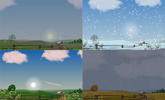 1. Il paesaggio riflette il tempo reale: le nuvole, la pioggia o la neve, l'erba che ondeggia al vento, la nebbia, i temporali.