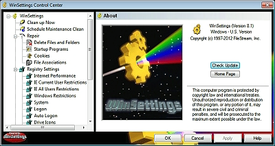 WinSettings non solo consente di cercare ed eliminare i cookie, offre anche la cancellazione sicura dei file in modo privato. Questa nuova versione permette poi di controllare quali cambiamenti sono permessi nelle impostazioni di Explorer e di Internet. Senza dimenticare la possibilità di personalizzare Windows, le icone della shell e riprodurre musica di sottofondo in vari formati (tra cui MP3). La versione corrente aggiunge funzioni che consentono di modificare il nome del computer, la schermata di logon, il titolo di IE e molti altri parametri. Inoltre, la funzione di Cattura dello Schermo offre 16 modi per catturare il desktop di Windows o porzioni di esso.