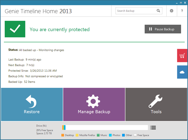 Genie Timeline 2013 è uno strumento di backup/ripristino volto a fornire backup completi, senza soluzione di continuità, e ripristinare facilmente i dati all’occorrenza. Genie Timeline rende facile proteggere i file indipendentemente da dove sono memorizzati: su computer, unità di rete esterna o altri drive. Genie Timeline funziona automaticamente per tutelare i file nuovi e modificati senza alcun intervento.