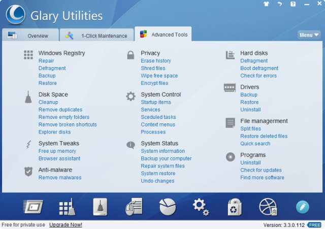 Glary Utilities si presenta con una interfaccia chiara e intuitiva, raggruppando gli strumenti per categoria in una classica struttura a tab. A differenza di atre soluzioni simili, Glary Utilities propone allutente la possibilità di una manutenzione automatica con un approccio tutto in uno, il che lo rende uno dei migliori programmi per la pulizia del PC soprattutto per gli utenti non esperti.