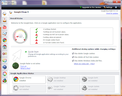 La maggior parte dei servizi offerti da Google, utilizza cookie di tracciamento o un ID univoco per trasferire i dati a Google. GoogleClean è un programma progettato principalmente per consentire il controllo di quello che Google è in grado di raccogliere dalle vostre attività online, non solo attraverso il browser web, ma anche specifiche applicazioni di Google come Picasa e Google Earth. Il programma si pone alcune domande sulle proprie abitudini, e poi si presenta con una schermata di riepilogo che illustra ciò che è stato trovato. È inoltre possibile visualizzare maggiori dettagli su ciò che il programma ha rilevato facendo clic sui pulsanti a sinistra dello schermo per accedere a vari schermi secondari, come ad esempio YouTube e le opzioni di sicurezza di Google Chrome.