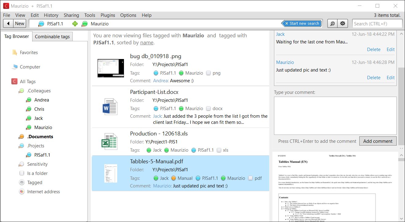 Tagga i file dal tuo menu di scelta rapida in Windows e condividi i dati con i tuoi colleghi. Oltre alla possibilità di inserire lo stesso file in più tag, Tabbles consente di descrivere il contenuto dei file, delle cartelle e dei segnalibri gestiti.