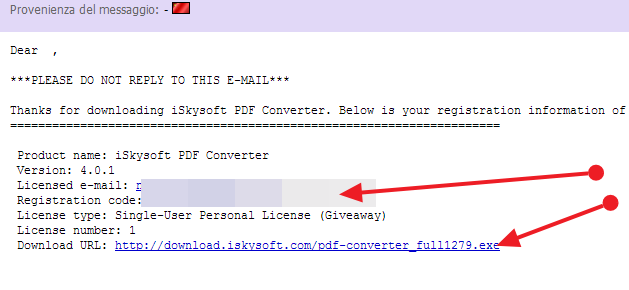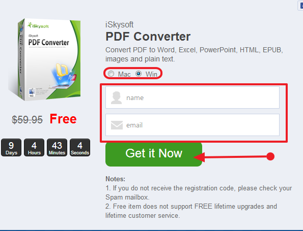 Per ottenere una licenza gratuita di iSkysoft PDF Converter, andare in questa pagina, condividere la promozione con dei tre social network, inserire il nome e la vostra e-mail e cliccare su “Get It Now”.