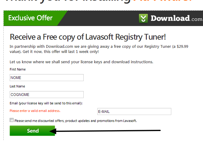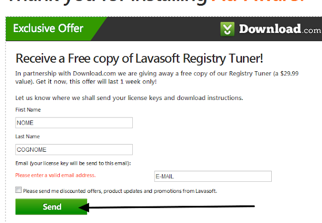 Nota: Questa promozione scade Domenica 17 Novembre 2013.Per ottenere una licenza gratuita di Lavasoft Registry Tuner, andare in questa pagina e inserire il nome, il cognome e la vostra e-mail.