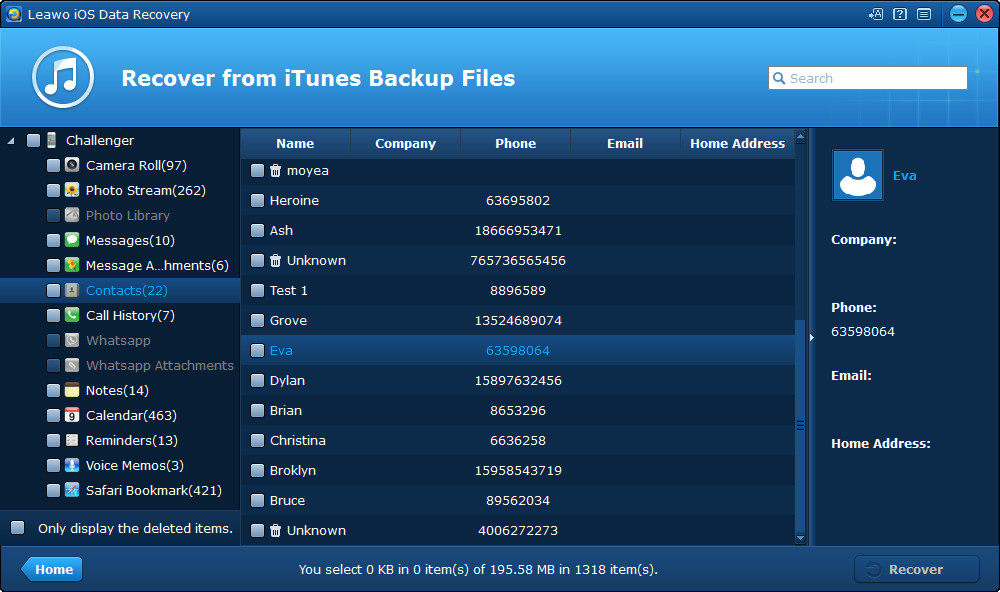 Leawo iOS Data Recovery è un potente programma di recupero dati in grado di recuperare i dati persi da tutti i modelli di iPhone, iPad e iPod touch. Permette di recuperare i dati persi dopo una cancellazione accidentale, l’aggiornamento di iOS, il ripristino delle impostazioni di fabbrica, la rottura o la perdita dei dispositivi, ecc.