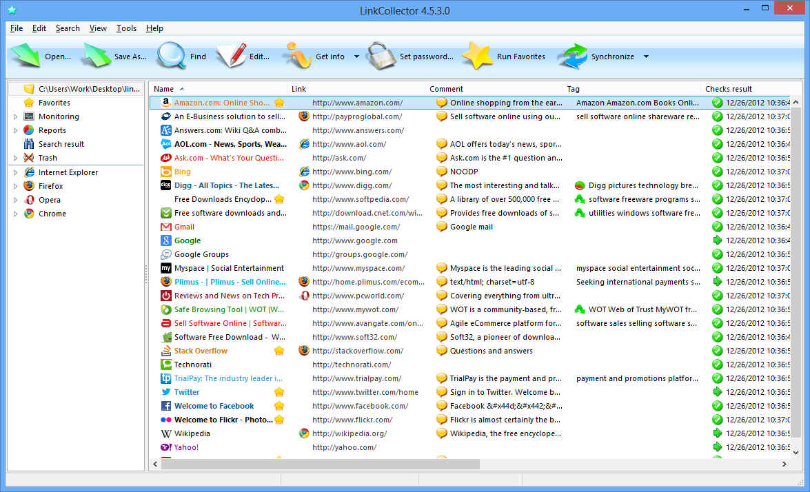 LinkCollector PC è un gestore per i segnalibri indipendente dai browser in grado di sincronizzare i segnalibri tra i più moderni Browser come Internet Explorer, Mozilla Firefox, Opera e Google Chrome. LinkCollector controlla tutti i segnalibri, cancellando doppioni e collegamenti “morti”.
