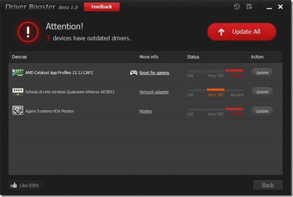 Come detto in precedenza, IObit Drive Booster è semplice da usare: una volta installato e avviato, il software in automatico effettuerà la scansione del sistema per capire se sia necessario o meno scaricare e installare driver più aggiornati. In caso di necessità, poi, il software permetterà di scaricare tutti i driver di cui avete bisogno e di installarli anche tutti insieme in un colpo solo! Comodissimo e semplicissimo! Volendo, comunque, potete anche installare singolarmente i driver uno per uno.