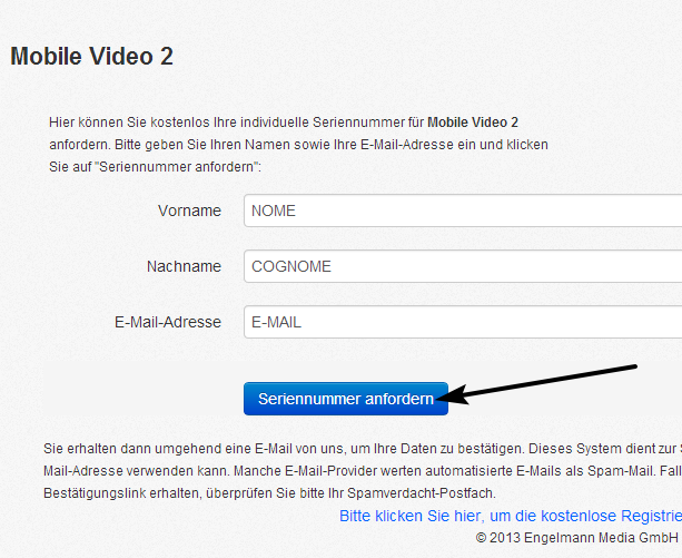 Per ottenere una licenza gratuita di Mobile Video 2, andare in questa pagina e inserire i dati richiesti.