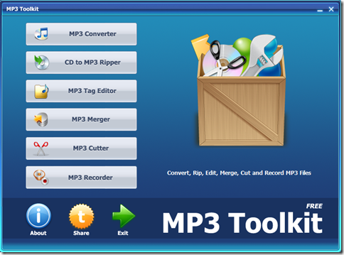 MP3 Toolkit consente di svolgere svariate operazioni sugli MP3. Tra le principali troviamo la possibilità di convertire,estrarre audio da video, copiare musica da CD, taggare file audio,unire, tagliare e registrare MP3.