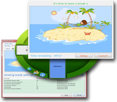 Riducete il rischio di RSI (Disturbo degli arti superiori da lavoro) grazie a WorkBreak. Questo programma mostra dei promemoria che invitano l’utente a fare delle brevi pause dal lavoro al computer, a svolgere esercizi per occhi e piedi e altro ancora per restare in forma. Se si soffre di dolori al corpo dovuti all’uso prolungato del computer, questo software aiuta a impostare le giuste pause per evitarne il peggioramento. Tutte le impostazioni di interruzione sono configurabili e forniscono immagini e animazioni insieme ai promemoria.