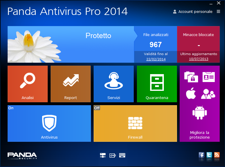 Panda Antivirus Pro 2014 è un antivirus che rileva ed elimina i virus prima che possano recare danno al vostro disco rigido. E' possibile proteggere il computer da più di 60.000 virus diversi, tra cui file criptati, polimorfo, di avvio, macro (Word, Excel e Access), trojan, applet Java, controlli ActiveX, siti Web maligni, internet, e persino futuri virus sconosciuti.