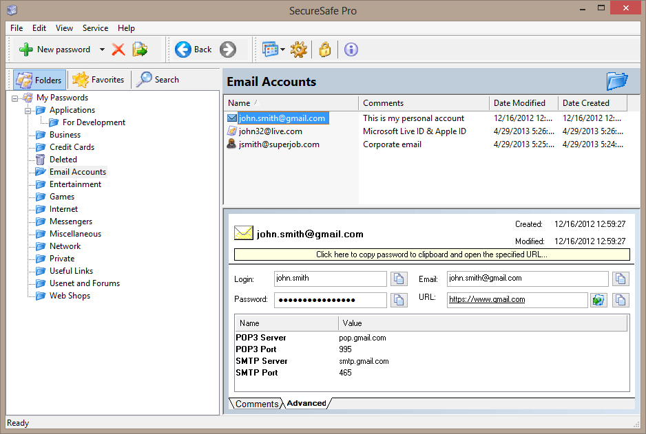 Difficile ricordare tutte le tue password e dati di accesso? Vuoi utilizzare solo password forti e sicure, uniche per ogni accesso? Vuoi tenere i file privati in un posto codificato?Password Manager SecureSafe Pro proteggerà le tue password e i file riservati. Mantiene tutte le informazioni in un file codificato sicuro sul tuo computer, protetto da uno standard codificato con livello militare.