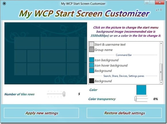 My WCP Start Screen Customizer ci viene in aiuto, è un Software Gratuito che ci permette di andare a cambiare i colori dell'Immagine di Sfondo, il Colore al Passaggio del Mouse, il Colore degli Hub in Stile Metro, il Bordo degli Hub e molto altro.
