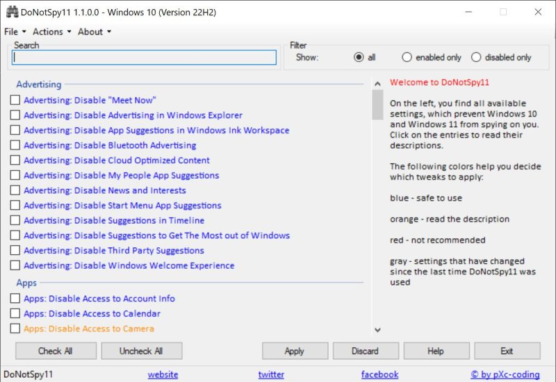 DoNotSpy11 offre un'interfaccia utente semplice ed intuitiva che consente agli utenti di selezionare facilmente le opzioni di privacy che desiderano disattivare o attivare.