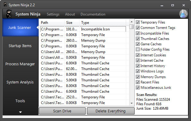 Dunque, come abbiamo visto, System Ninja è in grado di eliminare i file temporanei del sistema operativo, i file .tmp sparsi su tutto l’hard disk, i file Thumbs.db presenti su tutto l’hd, la cache dei giochi installati permettendo così di eseguirli più velocemente, i file di log di Windows.