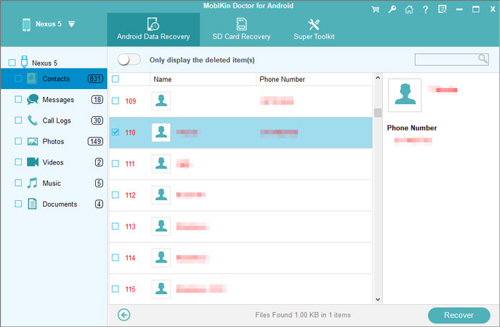 After make your phone recognized by the program, it will scan files on your device automatically. Meanwhile, contacts, text messages and call logs will be categorized and displayed in the left panel just like the below picture. Select the type of data you wish to restore and preview the detailed contents in the right panel as you like. (Please be noted that if you wish to get back the lost Android contacts, call logs or text messages, you need to root the phone at first.)
