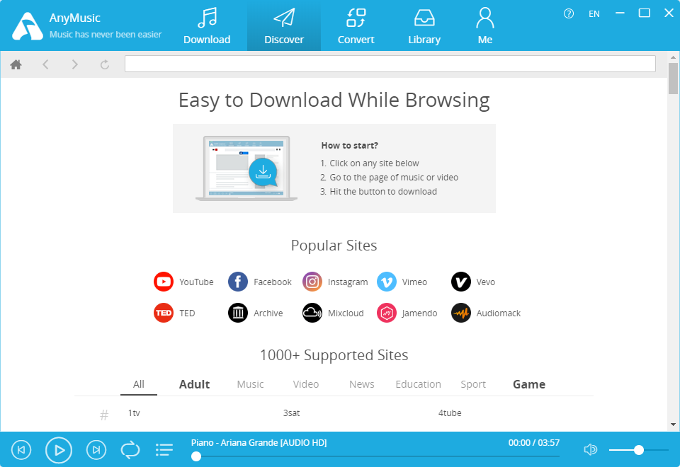AnyMusic è il miglio downloader con oltre 1000 siti supportati. Allo stesso tempo, è anche un music downloader poiché funziona perfettamente come convertitore, video HD downloader e riproduttore musicale.