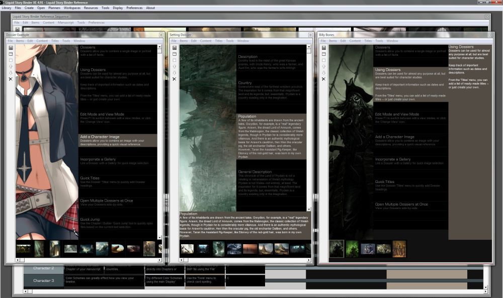Liquid Story Binder XE è progettato in maniera specifica per la scrittura narrativa. Include tutte le funzioni standard per la scrittura, come il controllo ortografico, la ricerca dei sinonimi, i modelli, la scelta dei font e la selezione degli stili per i paragrafi – insomma tutto il necessario per scrivere un grande romanzo. Permette di gestire timeline, profili, mappe mentali, dossier, gallerie, sequenze e storyboard. Liquid Story Binder è completamente personalizzabile. Consente di impostare combinazioni di colori personalizzate, salvare la posizione delle finestre, creare aree di lavoro, aprire decine di finestre contemporaneamente o solo una casella di testo semplice al centro dello schermo. La funzione Universal Search rende la ricerca dei contenuti estremamente semplice. Quella Ripetition Visualizer aiuta a trovare e rimuovere le parole e le frasi ripetitive. Liquid Story Binder XE utilizza i formati TXT, RTF e file ZIP per garantire accesso futuro ai documenti in qualsiasi software.