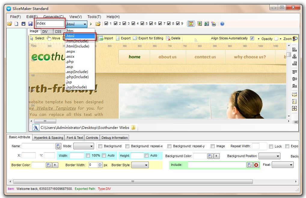 SliceMaker standard V3.5 supporta l’importazione di grafiche in PSD, PNG, JPG e GIF e supporta l’esportazione in HTML, HTM, ASP, PHP, PHP file include, ASPX, ASCX, JSP e JSP. I documenti esportati sono compatibili con IE, Firefox, Chrome, Opera, Maxthon, Netscape Navigator e altri browser. Con SliceMaker standard V3.5, opere che una volta richiedevano giorni per essere completati possono essere realizzati in pochi minuti. Se siete preoccupati da come creare una pagina Web in modo efficiente, SliceMaker standard V3.5 è la scelta che fa per voi.
