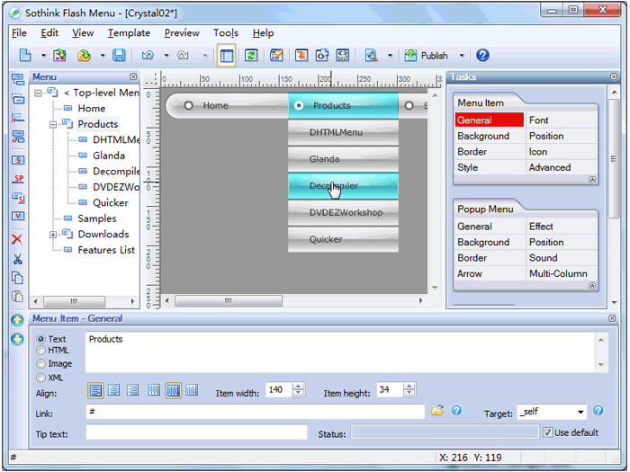 È possibile personalizzare lo stile dei menu fin nei minimi dettagli in modalità WYSWYG e di visualizzare l’anteprima del menu Flash all’istante.