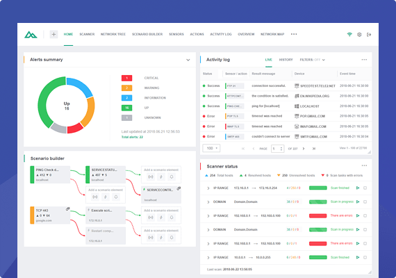 Esegui sensori, azioni e scansioni di rete programmati, crea mappe di rete, naviga nella cronologia. Accedi all'interfaccia e gestisci il sistema utilizzando il tuo browser da qualsiasi dispositivo mobile o stazionario.
