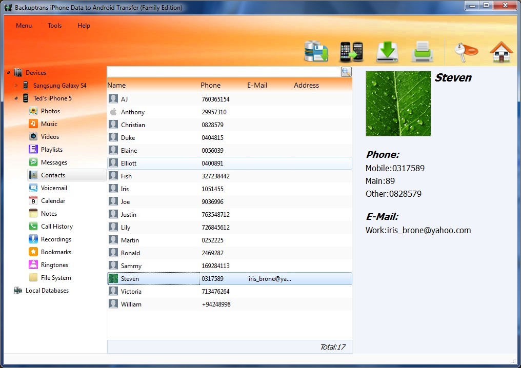 Backuptrans iPhone Data to Android Transfer è progettato per trasferire Musica, Video, Foto, Playlist, Messaggi (SMS e MMS), Contatti, Calendario, Cronologia chiamate, Bookmark, ecc. da iPhone a Telefoni Android direttamente via computer. Basta collegare entrambi i telefoni iPhone e Android al computer e cliccare il pulsante “ Trasferisci” e in pochi secondi, è fatta. Tutti questi dati verranno trasferiti in maniera impeccabile sull’Android.