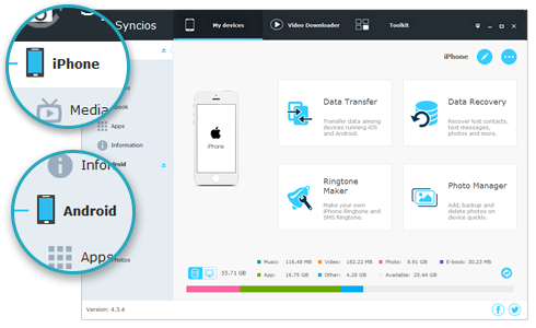 Syncios Mobile Manager è un tool manager basato su una piattaforma incrociata che supporta dispositivi mobili e tablet, completamente compatibile con i due principali sistemi operativi per smartphone – iOS e Android.