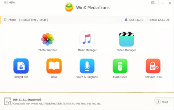 Mai più iTunes! WinX MediaTrans ti permette di avere maggiore flessibilità per personalizzare, importare, esportare, cancellare, fare il backup, persino rimpicciolire e convertire i contenuti media senza rischi per la cancellazione dei dati. Sia che i tuoi obiettivi sono le foto, i video, la musica, gli ebook, Voce o altro, ti permette di gestire liberamente tutti i file media, trasferire e sincronizzare i file tra PC e qualsiasi iDispositivo, completamente oppure in maniera selettiva.