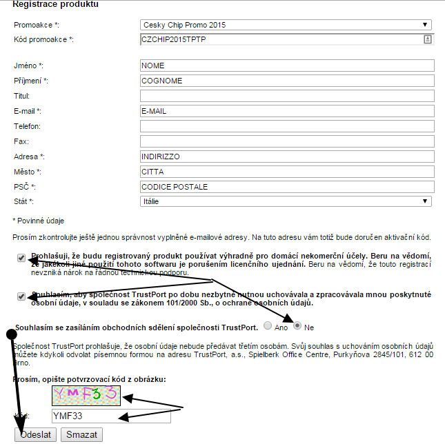 Poi per ottenere una licenza gratuita valida per 1 anno dovete andare su questa pagina ed inserire i dati richiesti usando magari Google Traduttore ed inserire nel box Kód promoakce il codice promozionale CZCHIP2015TPTP