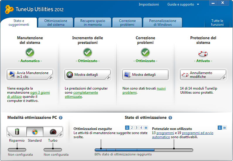 Con TuneUp Utilities 2012 il vostro sistema operativo Windows sarà più veloce, più comodo e più sicuro. Ti permette di configurare al meglio il sistema operativo, risolvendo i problemi che impediscono di avere le prestazioni ottimali, ottimizzando l'utilizzo della memoria e personalizzando l'aspetto di Windows.