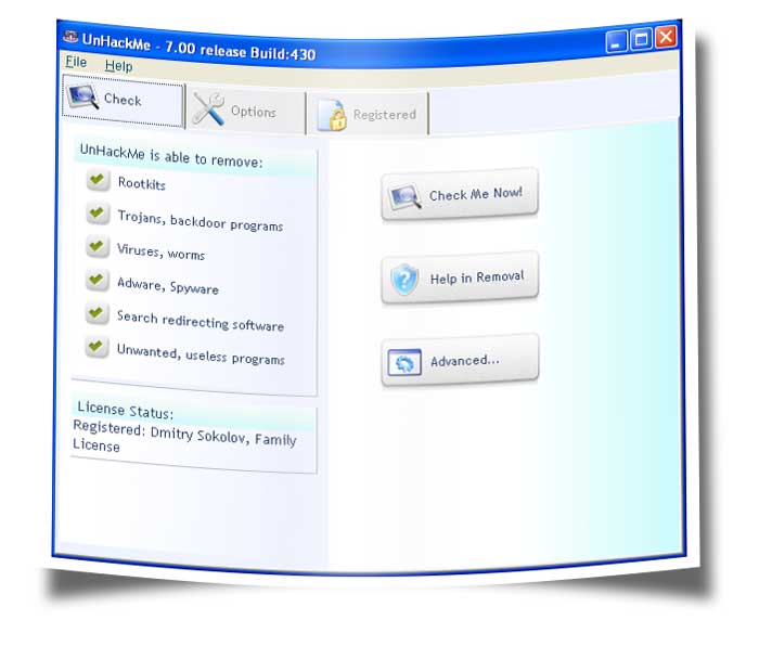 UnHackMe è stato inizialmente creato come software anti-rootkit, ma attualmente elimina tutti i tipi di software dannoso, ad esempio redirect della ricerca di Google, rootkit, trojan, backdoor, virus, worm, adware, spyware, keylogger, programmi indesiderati, ecc.