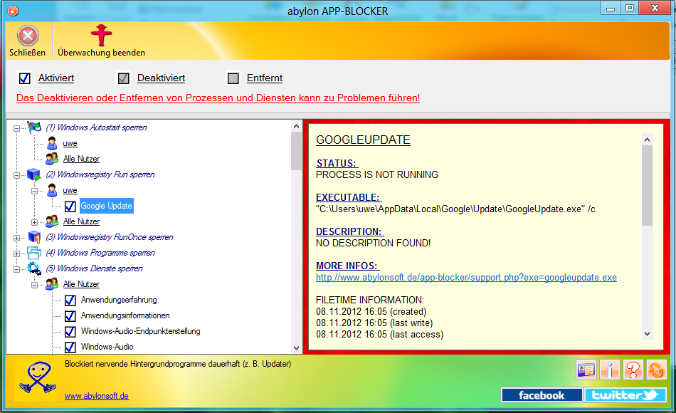 Abylon APP-BLOCKER rimuove i programmi impostati per l’avvio automatico nel menu Start di Windows e nelle chiavi Run, RunOnce eRunOnceEx del Registro. Evita ai processi di avviarsi in maniera permanente, blocca e rimuove i servizi di sistema. Il programma fornisce informazioni dettagliate per ciascun elemento e indica dei link per approfondimenti online.