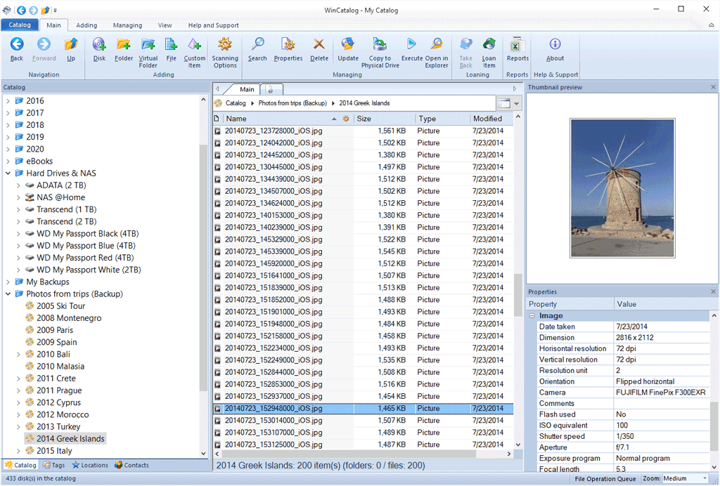 WinCatalog rende facile gestire grandi collezioni di file, come musica, filmati, immagini e documenti. Cerca qualsiasi file su qualsiasi dispositivo! Non importa se i file sono memorizzati su CD, DVD, schede di memoria, o hard disk, WinCatalog trova esattamente quello che si sta cercando in pochi secondi. La ricerca supporta i tag MP3, il contenuto degli archivi ZIP e altro ancora. Visualizza miniature di immagini, foto e file RAW.