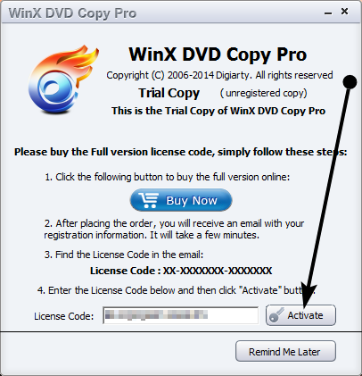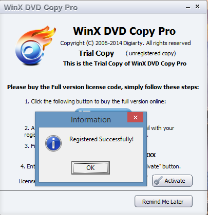 Nota: Inserire il codice di attivazione entro il 24 gennaio 2014. Dopo non sarà più possibile attivare la versione completa (senza limitazioni) di WinX DVD Copy Pro.