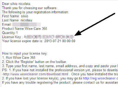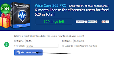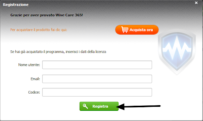 Al primo avvio di Wise Care 365, inserire il nome, la vostra e-mail e il codice di attivazione appena ricevuto via e-mail.