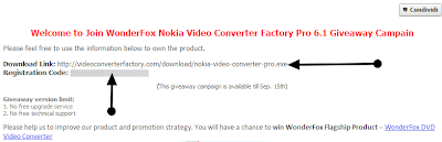 Nota: Questa promozione scade il 15 Settembre 2013.Per ottenere una licenza gratuita di WonderFox Nokia Video Converter Factory Pro, andare alla pagina promozionale Facebook e cliccare Mi piace.
