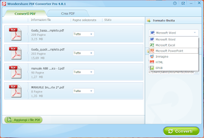 Wondershare PDF Converter Pro è un programma in grado di convertire file PDF scannerizzati in documenti Word, Excel, PowerPoint, EPUB, e HTML. Può anche convertire i documenti acquisiti in file PDF in testo (OCR) e convertire i PDF in formati compatibili con iPad, iPhone, iTouch, iBooks, Sony Reader, ecc ...