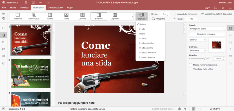 ONLYOFFICE v7.0 rende inoltre più facile aggiungere e modificare le transizioni nelle diapositive.