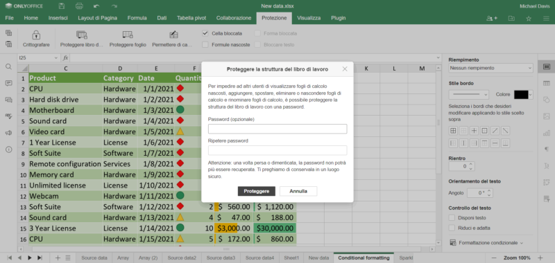 Tornando alla nuova versione, ONLYOFFICE v7.0 rende possibile proteggere fogli separati e cartelle di lavoro con password dedicate nella nuova scheda.