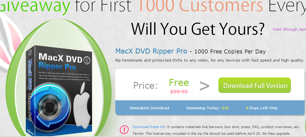 Per ottenere una licenza gratuita di MacX DVD Ripper Pro, andare in questa pagina e cliccare su Download full Version per scaricare il programma completo con tanto di licenza. Inoltre vi ricordo che sono disponibili 1000 copie al giorno.