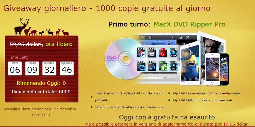 Lingua: IngleseNota: Per oggi non è possibile usufruire della promozione. Sono disponibili soltanto 1000 copie gratuite al giorno. Quindi correte ad andare nella pagina promozionale e afferrare la vostra copia gratuita di MacX DVD Ripper Pro (Affrettatevi).Per ottenere una licenza gratuita di MacX DVD Ripper Pro, andare in questa pagina.
