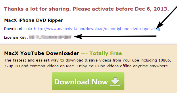 Per ottenere una licenza gratuita di MacX iPhone iPad DVD Ripper, andare in questa pagina, condividere la promozione, copiare il codice di attivazione e scaricare MacX iPhone iPad DVD Ripper.