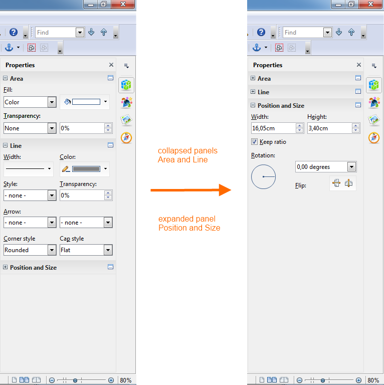 - Undici pannelli di proprietà sono stati convertiti da IBM Lotus Symphony: Allineamento, Area, Formato Cella, Grafica, Linea, Formato Numero, Pagina, Paragrafo, Posizione e dimensione, Testo e A capo.