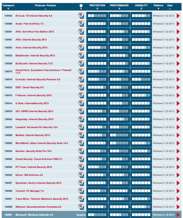 Dai risultati pubblicati Bitdefender ha ricevuto il punteggio più alto tra le soluzioni Anti-Virus su Windows 8 con un punteggio di 17, seguita da BullGuard con il 16,5 e Kaspersky Lab con 16. Due prodotti anti-virus, AhnLab e Comodo, hanno ottenuto ciuscuno il punteggio di 10, al di sotto della linea base, ma ancora appena sufficiente per ottenere la certificazione di AV-Test.